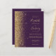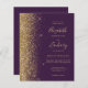 The left-hand edge of this elegant modern wedding invitation features a gold faux glitter border. The customisable text combines pale gold-coloured handwriting, copperplate and italic fonts on a dark purple background. The reverse side provides space for wedding details on a solid purple background, along with a QR code guests can scan to visit your website and RSVP.