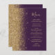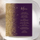 The left-hand edge of this elegant modern wedding menu features a gold faux glitter border. The customisable text combines gold-coloured whimsical handwriting script and copperplate fonts on a purple background. The reverse side features a matching purple and gold glitter design.