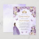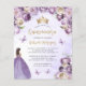 This lovely quinceañera invitation features a border of purple and ivory flowers on a pale purple watercolor background. A gold tiara, a dark-haired girl in a purple princess dress and small purple butterflies decorate the text. The word "Quinceañera" and the name of the guest of honour appear in elegant gold-coloured handwriting script, with the remaining text in grey sans serif font.
