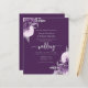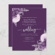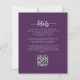 This elegant wedding invitation features purple and lilac floral bouquets set off with silver faux foil greenery in two corners, on a purple background. The customisable text combines silver grey serif, italic and handwriting fonts. The reverse side provides space for wedding details, along with a QR code guests can scan to visit your website and RSVP.