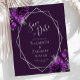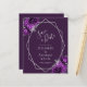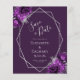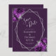 This elegant modern wedding save the date card features a silver geometric frame decorated with purple and silver floral bouquets on a purple background. The customisable text combines silver grey whimsical handwriting, copperplate and italic fonts. The reverse side is solid purple.