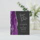 The left-hand edge of this elegant modern wedding save the date card features a purple watercolor agate border trimmed with faux silver glitter. The customisable text combines silver grey handwriting and copperplate fonts on an off-black background. The reverse side features a matching purple and silver agate design.