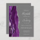 The left-hand edge of this elegant modern wedding invitation features a purple watercolor agate border trimmed with faux silver glitter. The customisable text combines handwriting, copperplate and italic fonts in silver grey on a medium grey background. Add additional details on the back, along with a QR code to help your guests visit your wedding website.