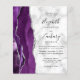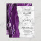 The left-hand edge of this elegant modern wedding invitation features a purple watercolor agate border trimmed with faux silver glitter. The customisable text combines black handwriting, copperplate and italic fonts on a grey and white marble background. The reverse side features a matching purple and silver agate design.