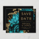 This elegant, moody wedding Save the Date card features a lush, romantic floral bouquet in turquoise with gold faux foil and glitter foliage on a black background. Customise the gold-coloured text in stylish fonts on a black rectangle, and add a brief additional text on the back, along with a QR code to help guests visit your wedding website.