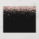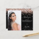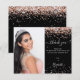 On front: Add a vertical size photo. A black background colour, decorated with rose gold faux glitter dust. Personalise and add a name and your thank you note.