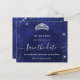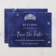 A girly and trendy Save the Date card for a Quinceañera, 15th birthday party. A blue uneven coloured background. Decorated with faux glitter dust and a tiara, crown. The text: Save the Date is written with a large trendy hand lettered style script.