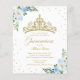 Elegant gold glitter tiara light blue floral affordable quinceanera party 4.5”x5.6” invitations. PLEASE NOTE: The envelopes are NOT INCLUDE; matching A7 envelopes are available to be purchase separately.