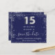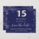 A trendy Save the Date for a Quinceañera, 15th birthday party. A navy blue background decorated with faux silver glitter dust. Personalise and add a date and name/age. The text: Save the Date is written with a large trendy hand lettered style script. Number 15 with a silver balloon style font.