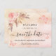 A girly and trendy Save the Date card for a Quinceañera, 15th birthday party. A blush pink, rose gold gradient background decorated with blush pink florals, pampas grass and butterflies.  Personalise and add a date and name/age.  The text: Save the Date is written with a large trendy hand lettered style script.