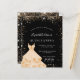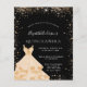 A modern, stylish and glamourous invitation for a Quinceañera, 15th birthday party. A chic black background with faux gold glitter dust and a dress. The name is written with a modern hand lettered style script. Personalise and add your party details.