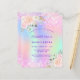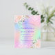 A girly and feminine Quinceañera, 15th birthday party invitation. On front: A rainbow, holographic coloured background in purple, pink, mint green, rose gold. Decorated with blush pink faux glitter, sparkles. Personalise and add a name and party details. The name is written with a hand lettered style script, purple coloured letters.