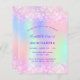 A girly and feminine Quinceañera, 15th birthday party invitation. On front: A rainbow, holographic coloured background in purple, pink, mint green, rose gold. Decorated with blush pink faux glitter, sparkles. Personalise and add a name and party details. The name is written with a hand lettered style script, purple coloured letters.