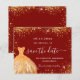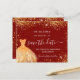 A girly and trendy Save the Date card for a Quinceañera, 15th birthday party. A stylish red background decorated with golden coloured faux glitter sparkles and a dress. Personalise and add a date and name/age. The text: Save the Date is written with a large trendy hand lettered style script.