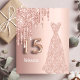Elegant, classic, glamourous and girly style Quinceañera, 15th birthday invitation. A rose gold dress with faux rose gold glitter drip. Rose gold faux metallic looking background. Personalise and add her name on front. Number 15 is written with a balloon style font.