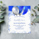 A white background. Decorated with royal blue faux glitter drips paint dripping look, sparkles. Royal blue and faux silver balloons. Personalise and add a name and party details. The name is written with a hand lettered style script.