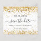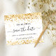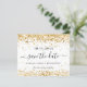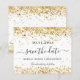 A girly and trendy Save the Date card for a Quinceañera, 15th birthday party. A stylish white background decorated with faux gold glitter dust. Personalise and add a date and name and text. The text: Save the Date is written with a large trendy hand lettered style script with swashes.