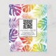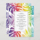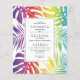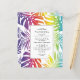 BUDGET Rainbow colours tropical leaves gay lesbian wedding invitation with QR code on the back to RSVP online. It displays a colourful pattern of tropical monstera and palm leaves in rainbow colours and your text in a frame with black border. The back includes a colourful pattern of tropical leaves and the QR code to be scanned for an online RSVP reply.