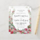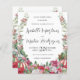 A modern red and white floral Christmas wedding design features red and white roses nestled in holly and berries. Red and white ornaments add a festive holiday touch. Your names are written in elegant calligraphy.