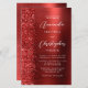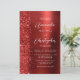 The left-hand edge of this elegant modern wedding invitation features a red faux glitter border. The customisable text combines white handwriting, copperplate and italic fonts on a red faux brushed metal background. The reverse side provides space for wedding details on a red brushed metal background, along with a QR code guests can scan to visit your website and RSVP, which saves the cost of printing and mailing separate RSVP cards.
