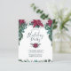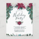 This rustic, boho design features a beautiful cascading watercolor bouquet of vintage burgundy red and white poinsettias along with small berries and lush winter foliage on the front at the top, including eucalyptus greenery and evergreen boughs, in shades of teal green with subtle gold detailing. Below the poinsettias is the text, "Please join us for a Holiday Party" in popular serif and calligraphy script typography for a hand-lettered look in dark teal green, followed by customisable text for the party details and more greenery and berries at the bottom. The back of the card features a rich teal green background with diagonal burgundy, pink and white stripes to match the front. You can personalise this item by changing the text in the product template.