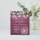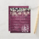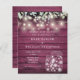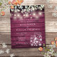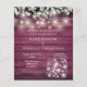 A stylish budget wedding invitation featuring pretty string lights, mason jars and sage and lilac leaves that tumble over a rustic burgundy red wood background. Designed by Thisisnotme©
