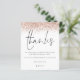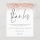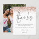 Budget Rose Gold Glitter Photo Bridal Shower Thank You. A budget price SMALLER 4.5” x 5.6” alternative. Available in a SEMI-GLOSS 110 lb CARD STOCK which is the default option (thicker for invitations), OR a SATIN FINISH 80 lb THINNER PAPER STOCK (ideal for enclosures). Envelopes are an optional extra and are slightly larger than the card size. A border of rose gold glitter is at the top, and Thanks is in a handwriting style script in dusty rose. Easily personalise the text to your own details. On the back swap in your favourite photo from your shower of portrait orientation.