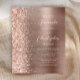 The left-hand edge of this elegant modern wedding invitation features a rose gold faux glitter border. The customisable text combines white handwriting, copperplate and italic fonts on a rose gold faux brushed metal background. The reverse side features a matching glitter and brushed metal design.