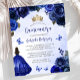 This lovely quinceañera invitation features a border of royal blue roses on a blue watercolor background. A gold tiara, a dark-haired girl in a royal blue princess dress and small blue butterflies decorate the text. The word "Quinceañera" and the name of the guest of honour appear in elegant royal blue handwriting script, with the remaining text in grey sans serif font.