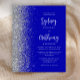 The left-hand edge of this elegant modern wedding invitation features a silver faux glitter border. The customisable text combines white calligraphy script and sans serif font on a royal blue background. The reverse side features a matching silver and royal blue design.