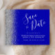This elegant budget save the date card features a silver faux glitter border. The customisable text combines white handwriting script, copperplate and italic fonts on a royal blue background. The reverse side features a matching royal blue and silver design.