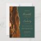 The left-hand edge of this elegant modern wedding invitation features a burnt orange and rust watercolor agate border trimmed with faux gold glitter. The customisable text combines gold-coloured handwriting, copperplate and italic fonts on a dark emerald green background. The reverse side provides spaces for 4 photos (1 square, 2 horizontal, 1 long vertical) and room for your wedding website URL or other information.