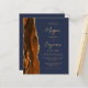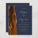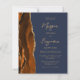 The left-hand edge of this elegant modern wedding invitation features a burnt orange watercolor agate border trimmed with faux gold glitter. The customisable text combines gold-coloured script and sans serif fonts on a dark navy blue background. The reverse side provides spaces for 4 photos (1 square, 2 horizontal, 1 long vertical) and room for your wedding website URL or other information.