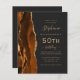 The left-hand edge of this elegant modern 50th birthday party invitation features a burnt orange and rust watercolor agate border trimmed with gold faux glitter. The customisable text combines gold-coloured handwriting, copperplate and italic fonts on a slate black background. Add RSVP instructions on the back of the card, along with a QR code guests can scan to respond online.