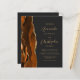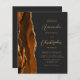 The left-hand edge of this elegant modern wedding invitation features a burnt orange and rust watercolor agate border trimmed with faux gold glitter. The customisable text combines gold-coloured script and sans serif fonts on a slate black background. The reverse side provides space for wedding details on a solid slate black background, along with a QR code guests can scan to visit your website and RSVP, which saves the cost of printing and mailing separate RSVP cards.