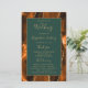 This elegant, modern wedding program features a burnt orange and rust agate background trimmed with gold faux glitter. The text appears in elegant gold-colored handwriting and copperplate fonts on a dark green rectangle.
