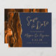 This elegant budget save the date card features a burnt orange and rust watercolor agate border trimmed with faux gold glitter. The customisable text combines gold-coloured handwriting script and sans serif fonts on a navy blue background. The reverse side features a matching burnt orange and gold agate design.