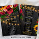 Elegant rustic budget wedding ceremony and party program PAPER FLYER (advertising type paper) template featuring beautiful bright yellow orange sunflowers and red burgundy marsala roses flower bouquets with strings of twinkle lights on a country style dark brown wooden background. +++++++++++ + Personalise it with your your details.+++++++++++ Suitable for rustic country vintage chic outdoor backyard summer garden or autumn fall farmhouse barn weddings.++++++++++++++++ PLEASE READ THIS BEFORE PURCHASING! This is a low budget affordable program printed on a FLYER. ++++ Please note that BUDGET PAPER IS THIN - You can upgrade to have this card printed on cardstock ++++ ENVELOPES NOT INCLUDED.