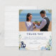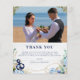 Budget photo wedding thank you card. Rustic beach wedding design combining nautical elements (navy anchor, knot, starfish and bleached wood) with beautiful floral bouquets of blue hydrangea, blush and white anemone flowers, eucalyptus leaves, dahlia, and greenery. Ideal for beach wedding, nautical wedding, destination wedding, summer wedding.