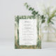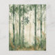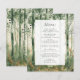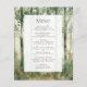 This wedding menu features a rustic watercolor forest landscape background in shades of green and gold. The customisable charcoal grey text appears on a rectangular white screen. The woodland scene is repeated on the back of the card.