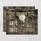 Budget rustic western wedding bull cow skull with horns vintage style save the date announcement flat card. Ranch grunge texture. Barn wood cowboy inspired. Antique sepia brown bison fine art. Image copyright Marg Seregelyi Photography.