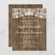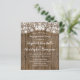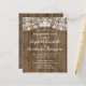 Rustic barn wood engagement party invitation with white faux lace trim. A beautiful illustration of white lace borders the top of the card, with the words the names of the future bride and groom in modern white calligraphy style script. Matching barn wood pattern on reverse.