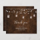 Beautiful design at a budget price! Beautiful dark wood with string lights and mason jars wedding thank you card. The mason jars have tiny hearts in them as well as lights. The hand-lettered script typography looks amazing.