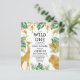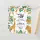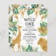 This "wild one" jungle safari themed baby shower invitation features gold faux foil animals (giraffe, lion and monkeys), gold and green jungle foliage, and a sprinkling of gold confetti on a white background. Add the name of the mum-to-be and shower details in black text. A coordinating jungle foliage pattern in green and gold on a white background decorates the back of the card.