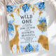 This "wild one" jungle safari themed boy's baby shower invitation features gold faux foil animals (giraffe, lion and monkeys), gold and blue jungle foliage, and a sprinkling of gold confetti on a pale blue background. Add the name of the mum-to-be and shower details in black text. A coordinating frame pattern of blue and gold leaves appears on the reverse.