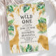 This "wild one" jungle safari themed baby shower invitation features gold faux foil animals (giraffe, lion and monkeys), gold and green jungle foliage, and a sprinkling of gold confetti on an ecru background. Add the name of the mum-to-be and shower details in black text. A coordinating jungle foliage pattern in green and gold decorates the back of the card.