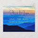 Mountain wedding save the date budget announcements. A beautiful golden sky over blue mountain ridges is the image with three lines of custom text in modern script and printed fonts. A simple, yet lovely, wedding announcement. Reverse is solid blue. This design is also available on an upgraded paper type.