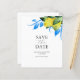 Announce your engagement with this budget wedding save the date invitation. It features a mix of classic and script typography with a boarder of my original watercolor yellow lemons with blue embellishments on a crisp white background. Use the template fields to personalise with your name and wedding date. A rustic yet elegant design for Mediterranean wedding themes and engagement announcements. To see the matching wedding stationery visit www.zazzle.com/dotellabelle