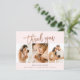 This modern 3 photo thank you note features rose gold handwritten script thank you and birth details on the front. The back includes a personal message from the entire family. Click the edit button to customise this design with your photos and details.