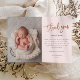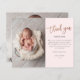 This modern photo thank you note features rose gold handwritten script thank you, personal message and a vertical photo on the front. The back includes a second baby photo that is a full bleed horizontal photo.